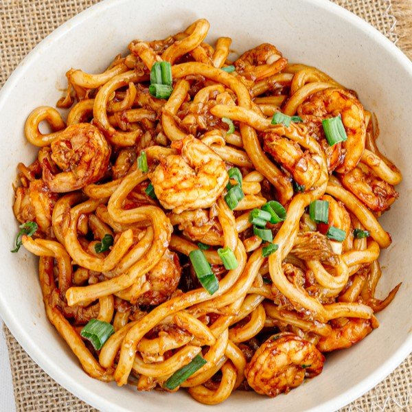 Asiatische Udon, Garnelen, Gemüse (Paprika, Karotten, Frühlingszwiebeln, Sprossen, Pilze, Bambussprossen), Aromaten (Knoblauch, Ingwer, Chili) und eine Würzsauce aus Sojasauce (hell/dunkel), gegebenenfalls Austernsauce, Reiswein und etwas Zucker, plus Öl (Erdnussöl, Sesamöl), oft mit Maisstärke und Eiweiß zum Marinieren des Fleisches für mehr Zartheit.