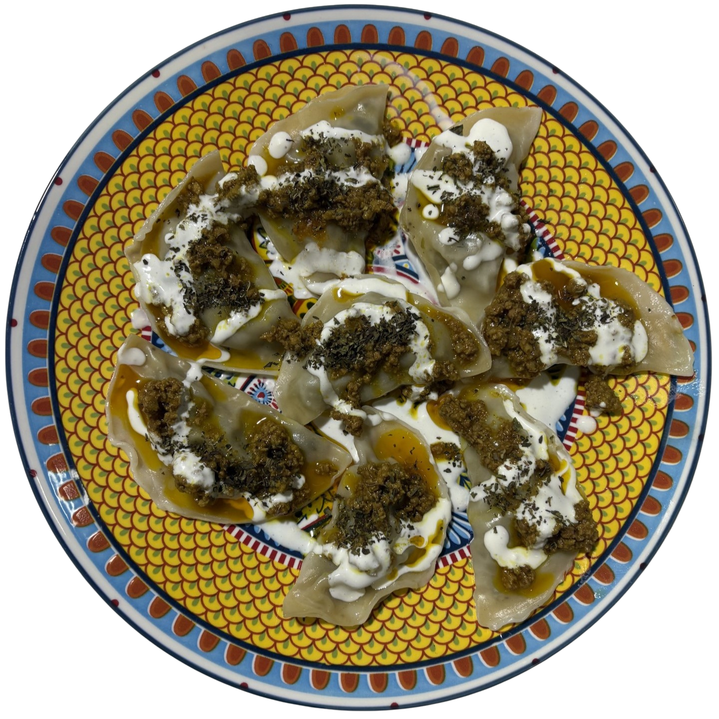 Maultaschen gefüllt mit Lauch und Spinat, dazu Linsen, mit Zwiebeln, Tomatensauce und Joghurt, garniert mit Petersilien