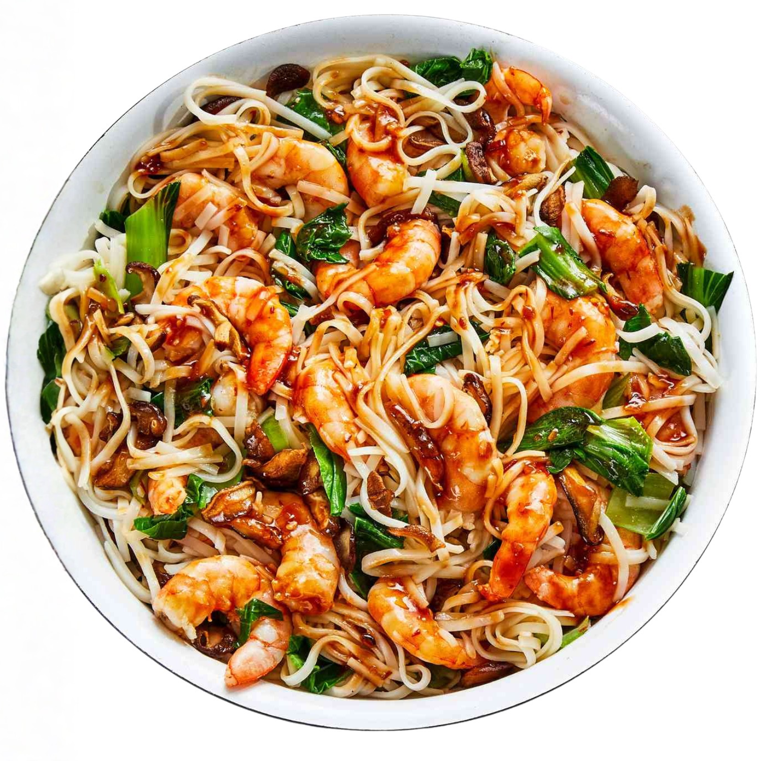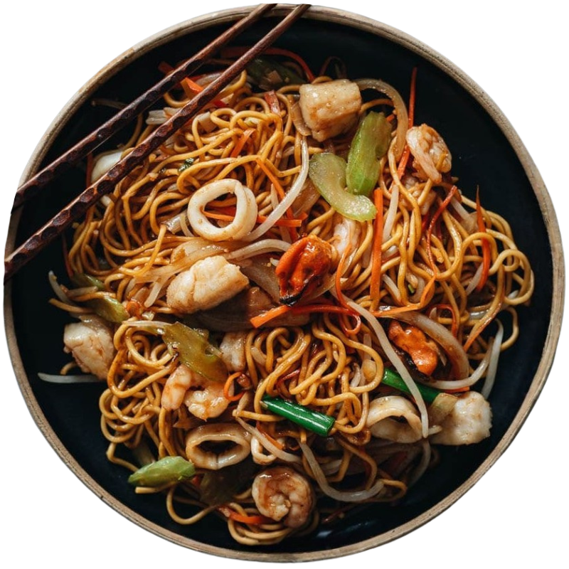 Asiatische Nudeln, Garnelen, Gemüse (Paprika, Karotten, Frühlingszwiebeln, Sprossen, Pilze, Bambussprossen), Aromaten (Knoblauch, Ingwer, Chili) und eine Würzsauce aus Sojasauce (hell/dunkel), gegebenenfalls Austernsauce, Reiswein und etwas Zucker, plus Öl (Erdnussöl, Sesamöl), oft mit Maisstärke und Eiweiß zum Marinieren des Fleisches für mehr Zartheit.