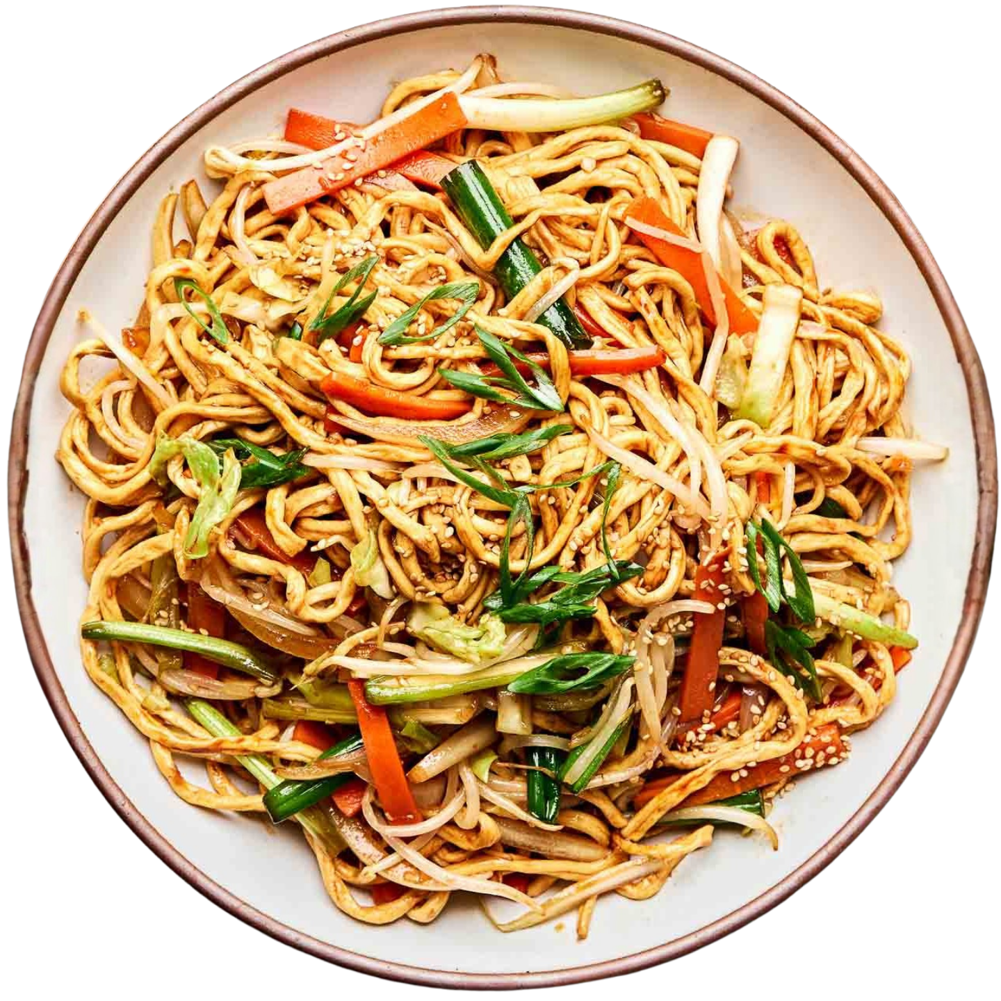 Asiatische Nudeln, Gemüse (Paprika, Karotten, Frühlingszwiebeln, Sprossen, Pilze, Bambussprossen), Aromaten (Knoblauch, Ingwer, Chili) und eine Würzsauce aus Sojasauce (hell/dunkel), gegebenenfalls Austernsauce, Reiswein und etwas Zucker, plus Öl (Erdnussöl, Sesamöl), oft mit Maisstärke und Eiweiß zum Marinieren des Fleisches für mehr Zartheit.