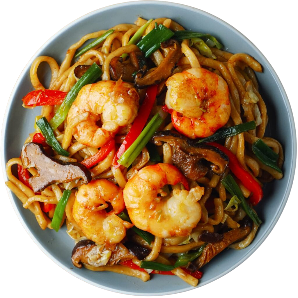 Asiatische Udon, Garnelen, Gemüse (Paprika, Karotten, Frühlingszwiebeln, Sprossen, Pilze, Bambussprossen), Aromaten (Knoblauch, Ingwer, Chili) und eine Würzsauce aus Sojasauce (hell/dunkel), gegebenenfalls Austernsauce, Reiswein und etwas Zucker, plus Öl (Erdnussöl, Sesamöl), oft mit Maisstärke und Eiweiß zum Marinieren des Fleisches für mehr Zartheit.